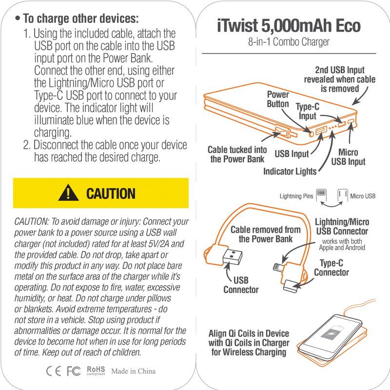 Use the wireless charging capability by placing any Qi-enabled device on the iTwist 5,000mAh 8-in-1 Combo Charger and pushing the power button to activate.This combo charger includes USB, USB Type-C, Lightning, and Micro USB connectors. There are 2 built-in USB ports to support wired charging. Plus 2 input ports are included for recharging the power bank (1 Micro USB port, and 1 USB Type-C port).