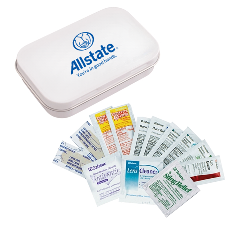 Be ready for anything outdoors with this compact Outdoor Necessities Kit packed inside a convenient tin. Includes 1 packet lip balm and 2 packets each of sunscreen lotion, instant hand sanitizer, insect repellent, sting relief, lens cleaner, burn gel, antiseptic wipes, and 4 bandages. Ideal for insurance agents to give away at community festivals, youth sports events, client appreciation outings, boat and RV shows, open houses, and safety campaigns?reinforcing protection and preparedness while keeping your brand top of mind. Features a label with the Allstate logo.