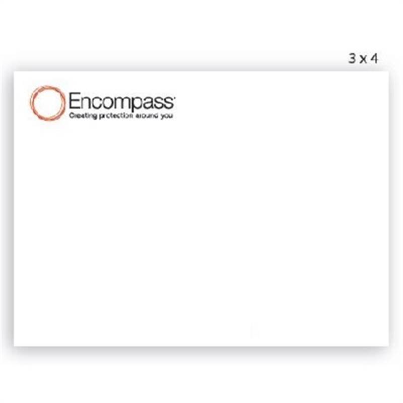 25 sheet note pad with adhesives on 4" edge. White paper only. Features the Encompass logo printed in red and black.
