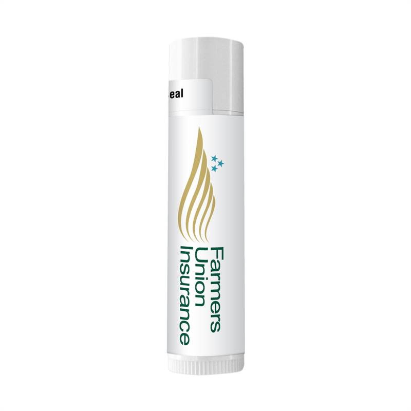 SPF 15 lip balm in white tube. Unflavored Beeswax base. USA Made in an FDA registered facility. Free of oxybenzone, PABA & Gluten free. Tube made from 35% post industrial recycled materials. DIN compliant. Features the Farmers Union Insurance logo. Unflavored.Product Dimensions: 2 5/8" x 5/8"Imprint Area: 1" x 1"This item is made to order. Please allow 3-4 weeks for delivery. This item is not returnable or exchangeable. Please order carefully.