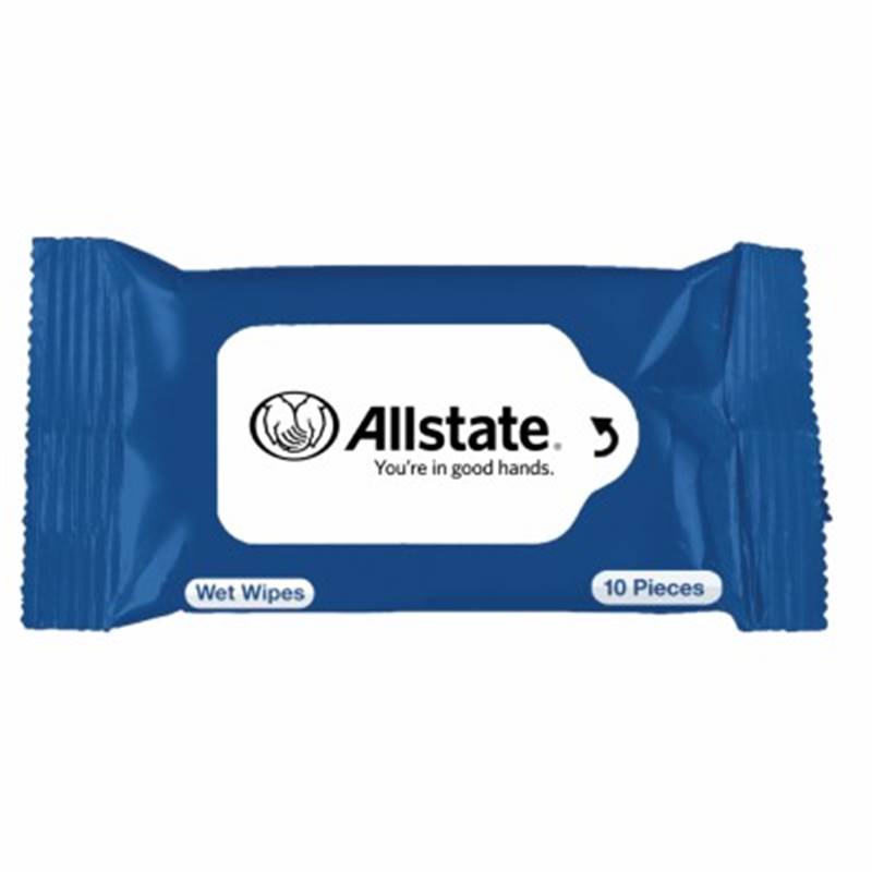 Blue wipes packet contains 10 wipes. Meets FDA requirements. Printed with the Allstate horizontal logo with tagline. Product dimensions: 6" W x 2 ?" H