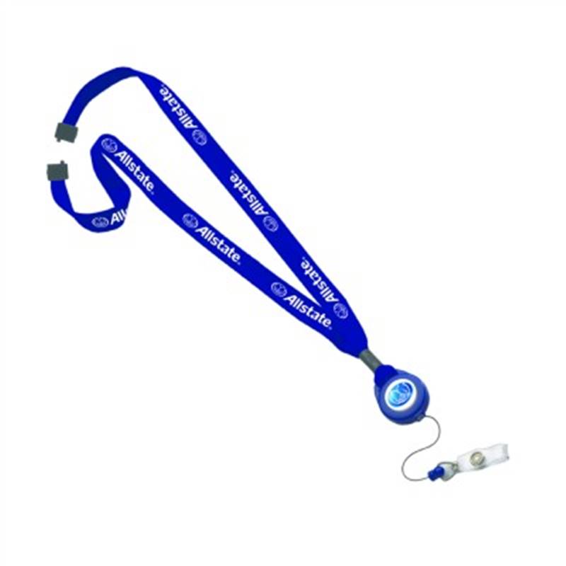 Royal blue lanyard with split ring, retractable badge reel, and convenience release. The lanyard is printed with the Allstate logo in white and the badge reel is printed with the Allstate Beacon (hands only).