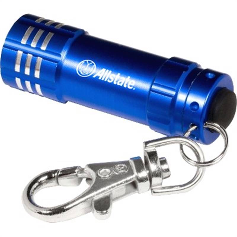 Micro 3 LED Torch/key holder. Mini aluminum flashlight with latching key holder. Three ultra-bright LED bulbs. Rubber push button on/off switch on end. Batteries included. Blue with the Allstate logo in white.