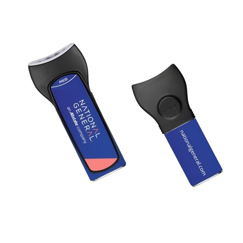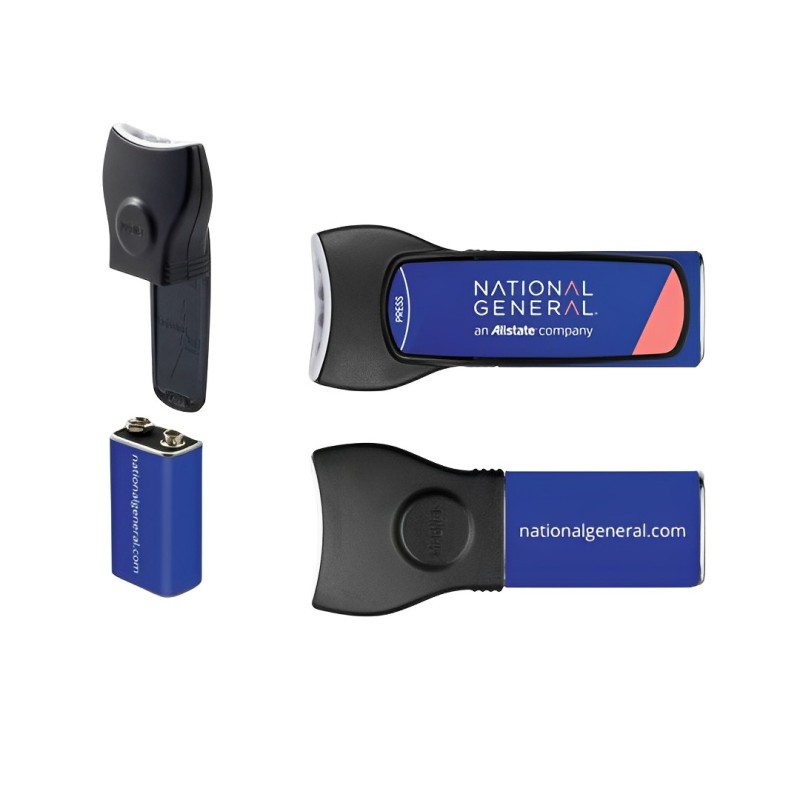 Flashlights are practical items that can be used in various situations, including power outages, camping trips, and emergency situations. People often appreciate receiving items that serve a purpose. Features the National General, an Allstate company logo on the flashlight and battery.